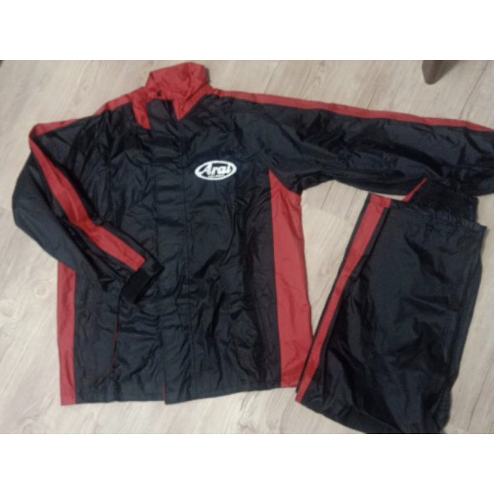 Baju hujan arai ini mempunyai kain yang selesa dan tidak tebal yang paling penting baju hujan ini mempunyai garisan pantulan cahaya sesuai untuk digunakan jika hujan pada waktu malam. Kelebihan Arai ni sebab baju and seluar dia ada grip untuk elak air masuk dalam baju. Ketumpatan dan keanjalan adalah parameter utama baju hujan yang berkualiti.