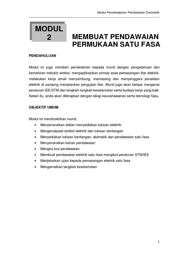 Kandungan buku ini bersesuaian bagi pelajar dan pendawai yang melakukan kerje-kerja pemasangan pendawaian elektrik 1 fasa. SISTEM BEKALAN 13 RUJUKAN. Pendawaian Elektrik 1 Fasa 4 PENAFIAN Buku panduan ini dihasilkan untuk memberikan pengajaran dan menyalurkan maklumat umum mengenai subjek yang dibincangkan.